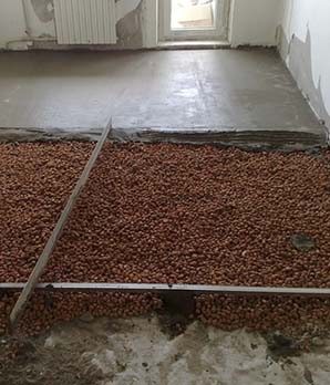 - Плавающей. Этот вид заключается в укладывании раствора на тепло-, гидро- и звукоизолирующие слои или плиты. Имеющий повышенную плотность полиетилен или бумага, которая пропитывается битумом или маслом. При использовании пробковых или полистирольных напольных плит, матов из минерального волокна или стекловолокна гарантируется тепло- и звукоизоляция.